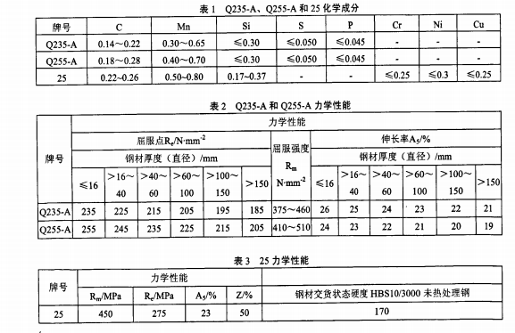 船用鍛鋼法蘭目前有一個國家標準、四個船舶 行業(yè)標準,即GB/T10746.1989《船用對焊鋼法蘭(四 進位)》、CB/T47.1999《船用對焊鋼法蘭》、 CBMl017—1981《PN3.0MPa對焊鋼法蘭》、CBM 1017.1981《PN4.OMPa對焊鋼法蘭》、CBM 1017—1981《PN6.3MPa對焊鋼法蘭》.GB/T 10746.1989和CB/T47—1999規(guī)定法蘭的材料是 Q235一A或Q255.A;CBMl017.1981等三個船舶外 貿(mào)標準規(guī)定法蘭的材料是鋼25.這三種材料的化學(xué) 成分和力學(xué)性能見表1、表2和表3.
