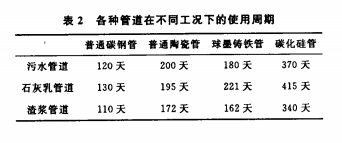 在特定的工況條件下,我車間除使用碳鋼管道 外,在特殊材質(zhì)選用上,曾前后應(yīng)用過普通陶瓷管 道、球墨鑄鐵管道和碳化硅管道。在表1中的工況 條件下,將使用周期總結(jié)如表2。