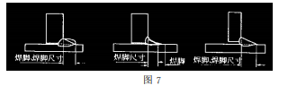 實(shí)際生產(chǎn)中%常把焊腳與焊腳尺寸混為一談%如有 人在工藝文件上要求焊腳尺寸為多少%標(biāo)注角焊縫符 號(hào)時(shí)%將 -說成是焊腳尺寸或焊角高度等%這都是錯(cuò) 誤的(究其原因是沒弄清焊腳與焊腳尺寸這兩個(gè)概念 的含義(焊腳是角焊縫的橫截面中從一個(gè)直角面上的 焊趾到另一個(gè)直角面表面的最小距離%而焊腳尺寸為 在角焊縫橫截面中畫出的最大等腰直角三角形中直角 邊的長(zhǎng)度(我們通常工藝上要求的*符號(hào)中標(biāo)注的檢測(cè) 工具檢測(cè)的是焊腳而非焊腳尺寸%對(duì)于平凸角焊縫%從 理論上來說%焊腳等于焊腳尺寸%而凹面角焊縫則焊腳 尺寸小于焊腳%如圖 .所示(