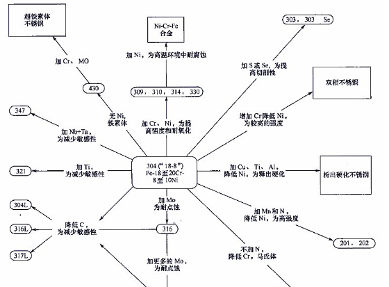 不銹鋼是至少含有大約11%Cr(質(zhì)量分?jǐn)?shù))的鐵基合金,其含量就是為防止在未經(jīng)污染的大氣中生成鐵銹所需要的(故命名為不銹)。不銹鋼幾乎沒有含量高于30%Cr或低于50%Fe(質(zhì)量分?jǐn)?shù))的。它們通過形成一種看不見的富鉻氧化物的表面膜粘附于表面,由此得到其不銹的性能。這種氧化膜能在有氧氣存在的條件下生成并能自我修復(fù)。為改善一些特定特性還要加入一些其他元素,包括鎳、鉬、銅、鈦、鋁、硅、鈮、氮、硫和硒。w(C)從低于0.03%到某些馬氏體牌號(hào)里的1.0%以上。圖中有效地概括了不銹鋼家族中成分和性質(zhì)的聯(lián)系。