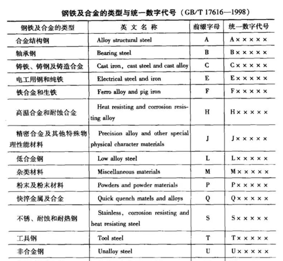 根據(jù)GB/T17616-1998的規(guī)定,鋼鐵及合金的類型與統(tǒng)一數(shù)字代號(hào)如下表所示: